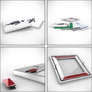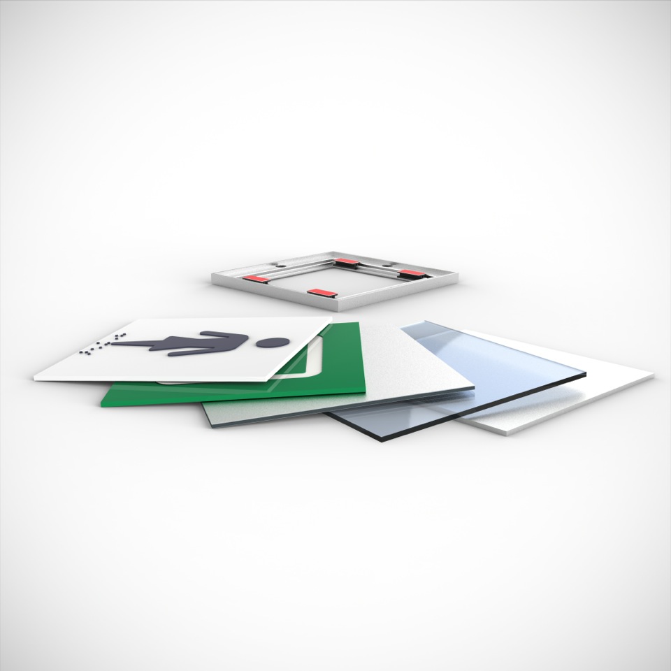 Voor de plaatjes kunnen verschillende materialen gebruikt worden: PVC, ACM, acrylaat, aluminium, enz..., hetgeen een hoge graad van
