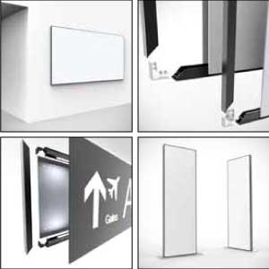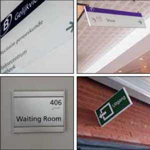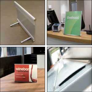 Onze flexibele signsystemen zijn inzetbaar als wandbord, ophangsysteem, tafelstandaard of als een haaks (projectie) model.