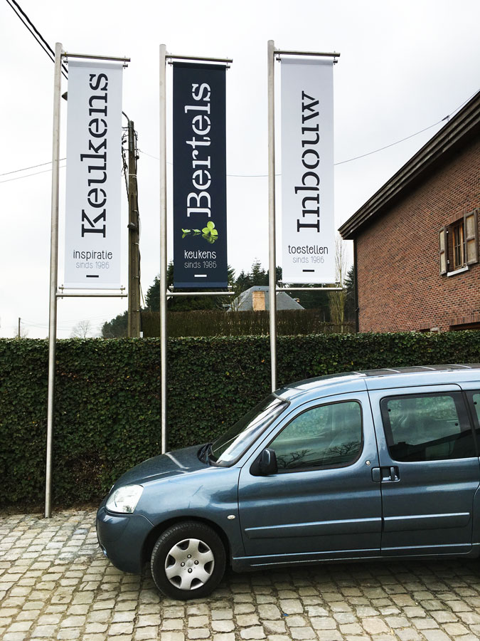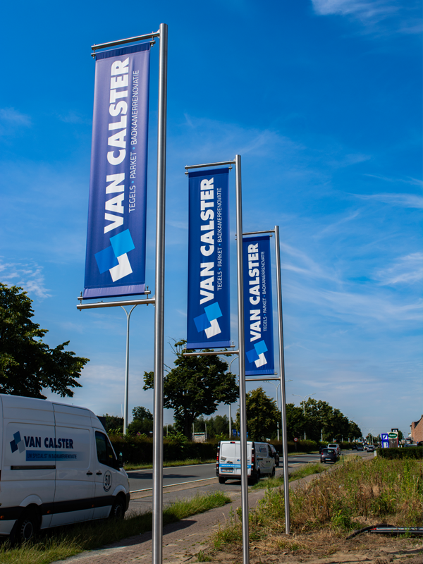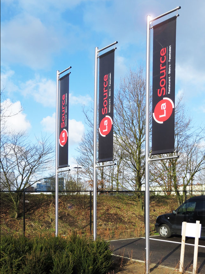 uit Inox/RVS of uit staal vervaardigde paalbanieren in elke RAL kleur met strak gespannen dubbelzijdige banieren.